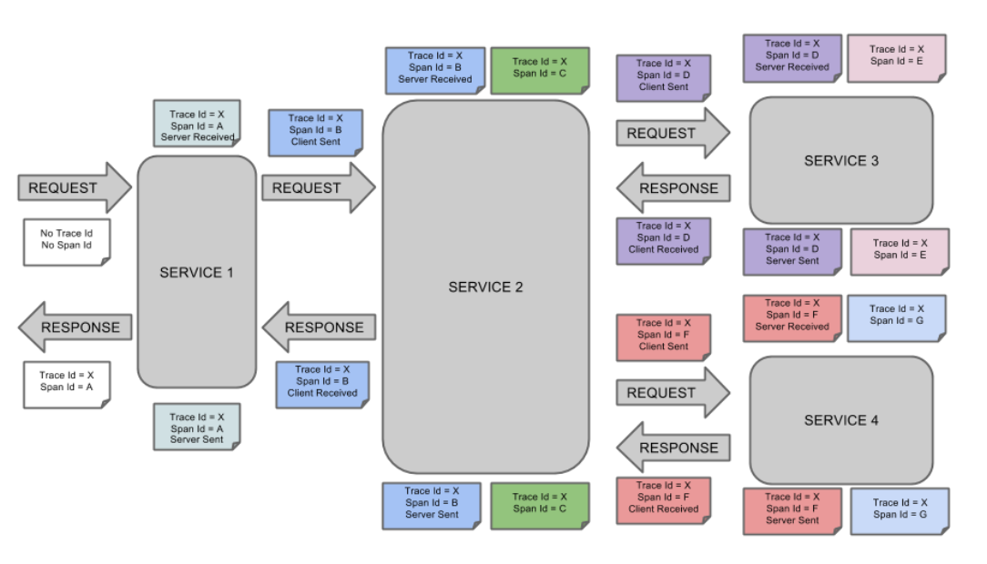 - Service 1์ด ์์ฒญ์ ์ฒ๋ฆฌํ ํ, Trace ID = X์ Span ID = A๋ฅผ ์์ฑํ์ฌ ํ์ ์๋น์ค๋ก ์ ๋ฌํ๋ค.