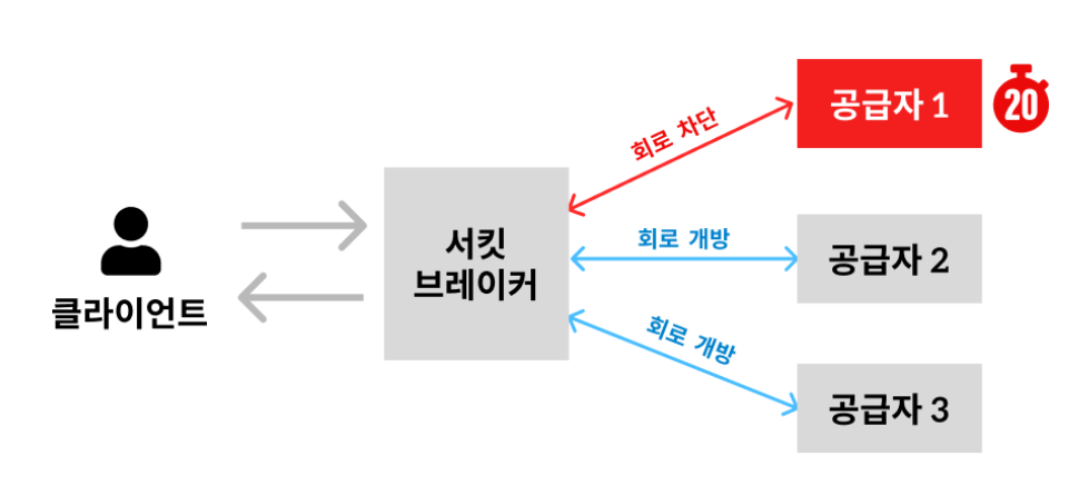 ์์ ๊ทธ๋ฆผ์ฒ๋ผ ์ฅ์ ๊ฐ ๋ฐ์ํ ์๋น์ค์ ๋ํด์๋ ํ๋ก๋ฅผ ์ฐจ๋จํจ์ผ๋ก์จ ์ฅ์ ๊ฐ ๋ฐ์ํ ์๋น์ค์ ๋ํ ๋ถํ์ํ ํธ์ถ์ ๋ฐฉ์งํ์ฌ ์ฑ๋ฅ์ ์ ์งํ ์ ์๊ณ , ๊ณผ๋ถํ๋ก ์ธํด ์์คํ ์ ์ฒด๊ฐ ๋ค์ด๋๋ ๊ฒ์ ๋ฐฉ์งํ๋ค.