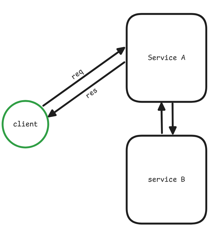 ์์ ๊ฐ์ด ํด๋ผ์ด์ธํธ๊ฐ ์๋น์ค A๋ฅผ ํตํด์ ์์ฒญ๊ณผ ์๋ต์ ๋ฐ๊ณ ์๋น์ค A๋ client์ ์์ฒญ์ ์๋น์ค B๋ก ์ ๋ฌํด B๋ก๋ถํฐ ์จ ์๋ต์ client์๊ฒ ์ ํด์ค๋ค๊ณ ๊ฐ์ ํ์.