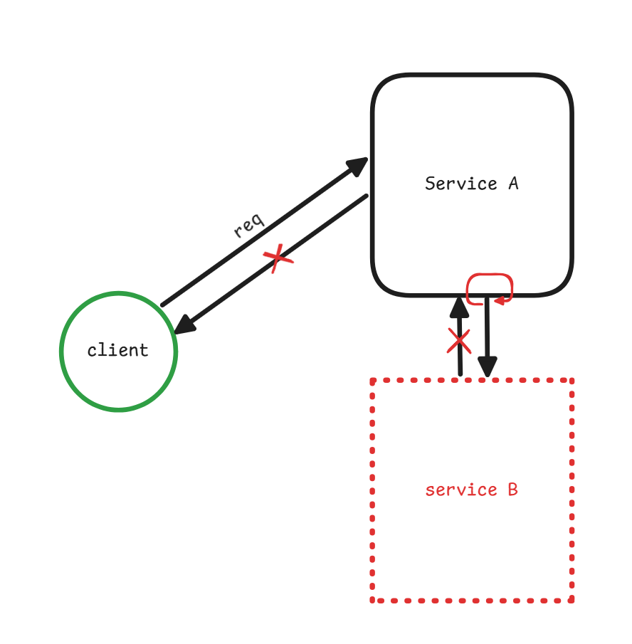 ๊ทธ๋ฌ๋, ํ์์ ๊ฒฝ์ฐ์๋ ์๋น์ค B๊ฐ ์ฃฝ์ด์๋๋์ ์๋น์ค A๋ ๊ณ์ํด์ ์ฐ๋ ๋๋ฅผ ์ฌ์ฉํด๊ฐ๋ฉฐ ์๋น์ค B์ ๋ํ ์๋ต์ ๋ฐ๊ธฐ ์ํด ์์ฒญ์ ๊ณ์ ๋ ๋ฆฌ๊ณ ๊ธฐ๋ค๋ฆฌ๊ณ ๋ฅผ ๋ฐ๋ณตํ ๊ฒ์ด๋ค. ๊ทธ๋ฆฌ๊ณ ์ด๋ฌํ ๋ฐ๋ณต์ ๊ฒฐ๊ตญ ์ฐ๋ ๋์ ๊ณ ๊ฐ๋ก ์ด์ด์ ธ ์๋น์ค A์๋ ์ฅ์ ๊ฐ ๋ฐ์ํ ๊ฒ์ด๋ค.