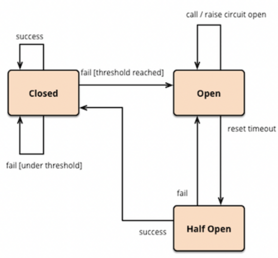 - Half-Open (ํ ์คํธ ์ํ): open ์ํ ์ดํ ์ผ์ ์๊ฐ์ด ์ง๋ ํ, ์ํท์ด ๋ฐ์ฏค ์ด๋ ค ์ผ๋ถ ์์ฒญ์ ํ์ฉํ๋ค. ๋ง์ฝ ์์ฒญ์ด ์ฑ๊ณตํ๋ฉด ๋ค์ Closed ์ํ๋ก ์ ํํ๊ณ , ์คํจํ๋ฉด Open ์ํ๋ฅผ ์ ์งํ๋ค.