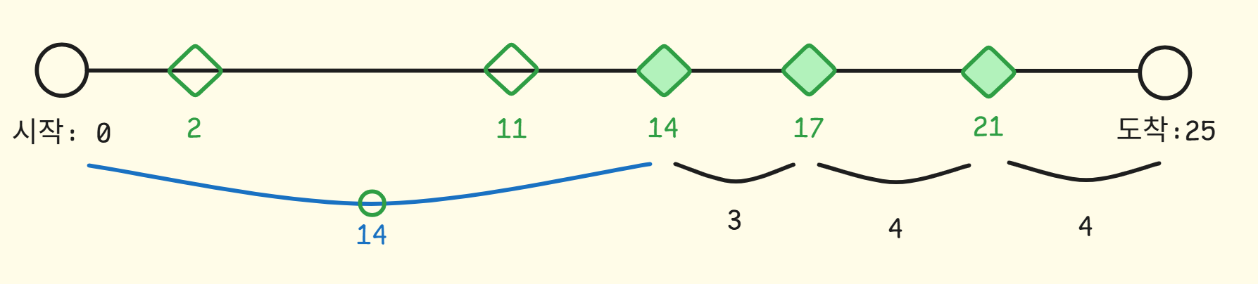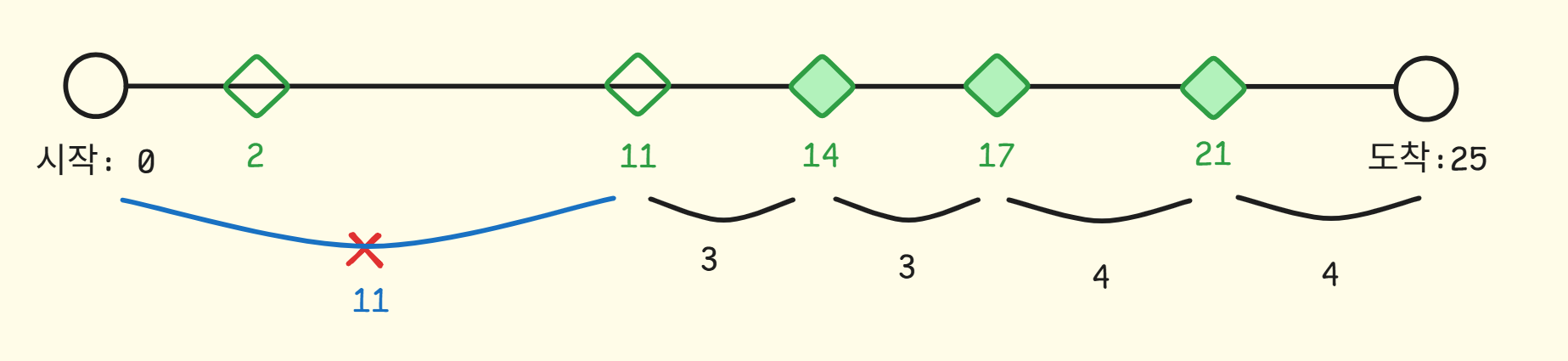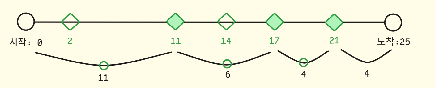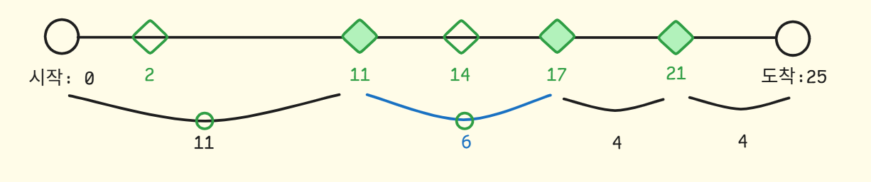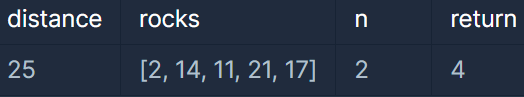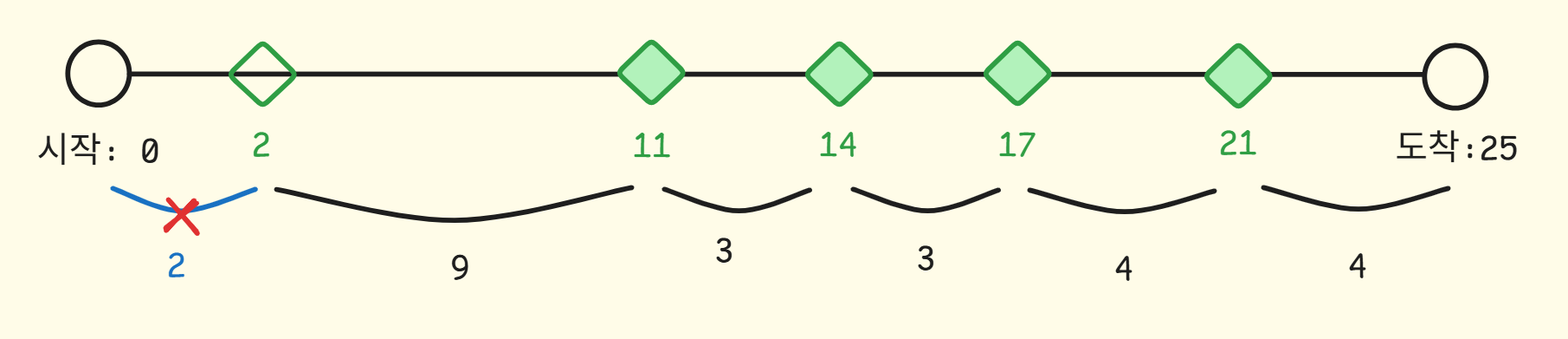 ์ถ๋ฐ์ง์ ๋ถํฐ distance๋งํผ ๋จ์ด์ง ๊ณณ์ ๋์ฐฉ์ง์ ์ด ์์ต๋๋ค. ๊ทธ๋ฆฌ๊ณ ๊ทธ์ฌ์ด์๋ ๋ฐ์๋ค์ด ๋์ฌ์์ต๋๋ค. ๋ฐ์ ์ค ๋ช ๊ฐ๋ฅผ ์ ๊ฑฐํ๋ ค๊ณ ํฉ๋๋ค. ์๋ฅผ ๋ค์ด, ๋์ฐฉ์ง์ ์ด 25๋งํผ ๋จ์ด์ ธ ์๊ณ , ๋ฐ์๊ฐ [2, 14, 11, 21, 17] ์ง์ ์ ๋์ฌ์์ ๋ ๋ฐ์ 2๊ฐ๋ฅผ ์ ๊ฑฐํ๋ฉด ์ถ๋ฐ์ง์ , ๋์ฐฉ์ง์ , ๋ฐ์ ๊ฐ์ ๊ฑฐ๋ฆฌ๊ฐ ์๋์ ๊ฐ์ต๋๋ค.