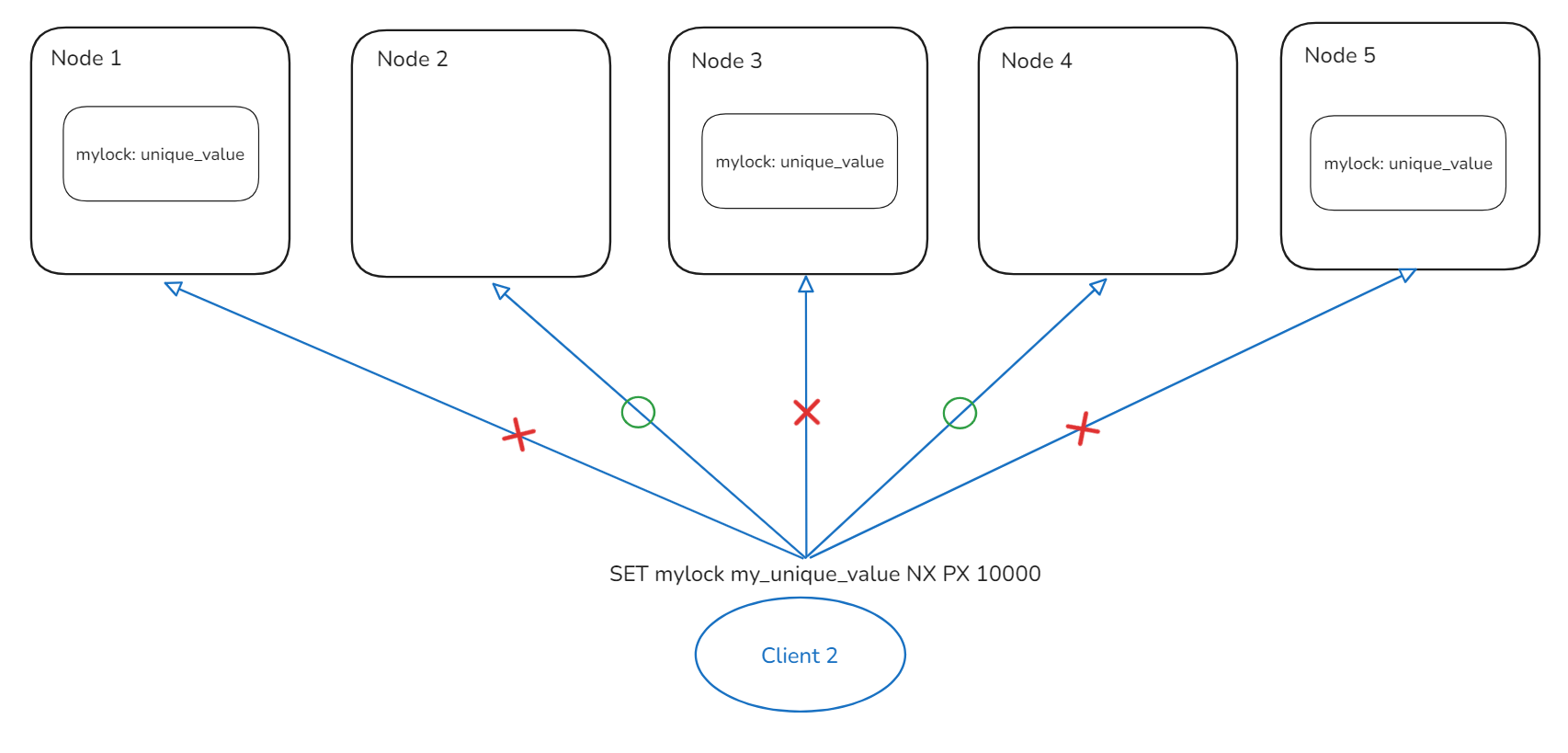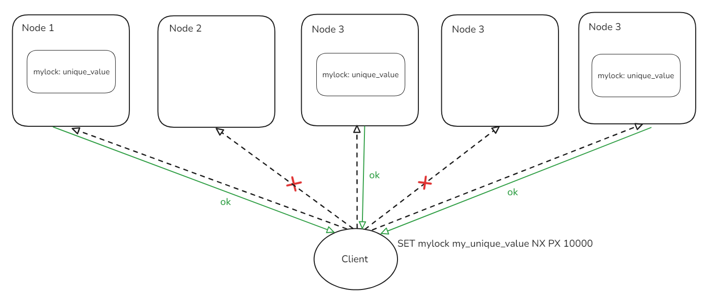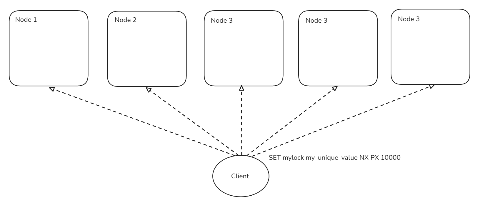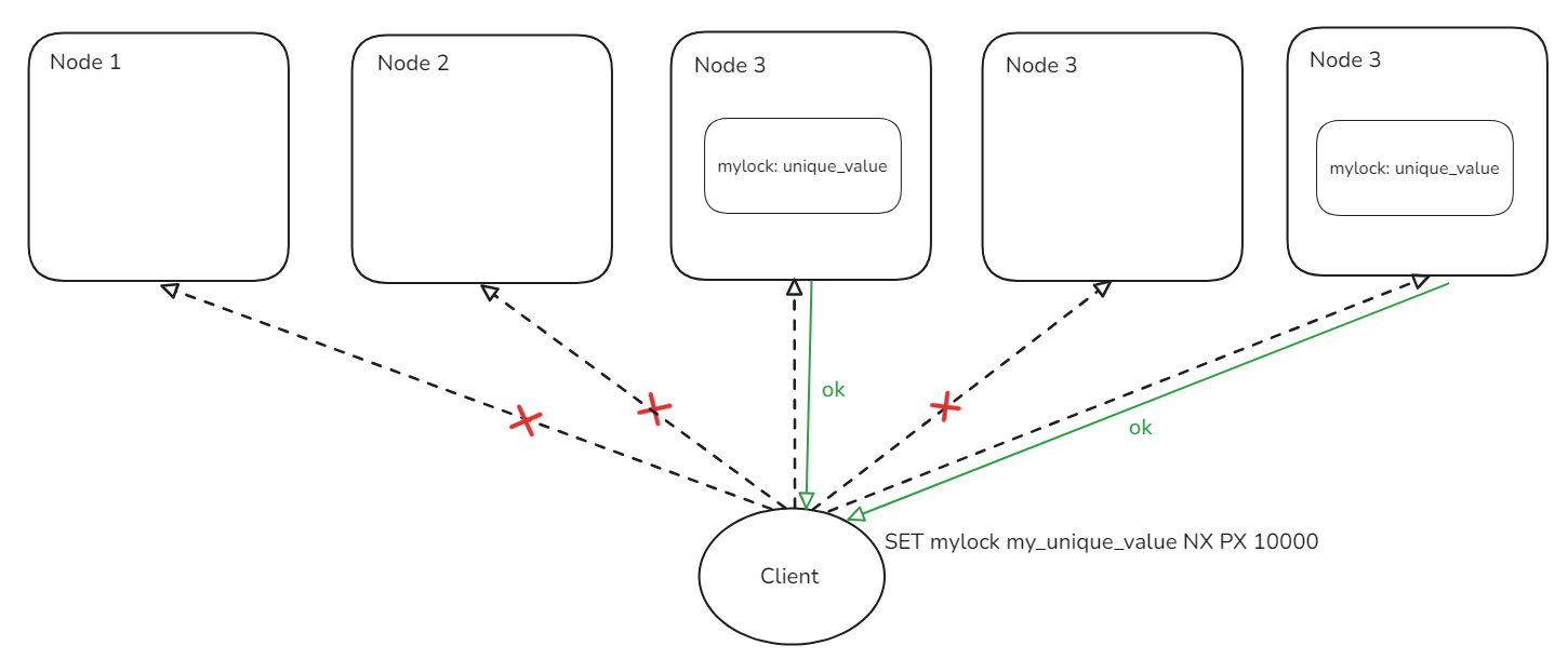 ํด๋ผ์ด์ธํธ๋ ๊ฐ Redis ์๋ฒ์ SET mylock my_unique_value NX PX 10000 ์ ๊ฐ์ ํ์์ผ๋ก ๋ฝ ์์ฒญ์ ๋ณด๋ธ๋ค.