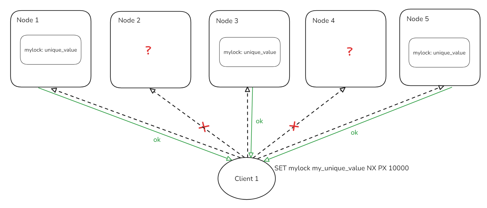 ๊ณผ๋ฐ์ ๋ฝ ํ๋์ ์คํจํ๊ฑฐ๋ TTL์ ์ด๊ณผํ ๊ฒฝ์ฐ, ๋ฝ ํ๋์ ์คํจํ ๊ฒ์ผ๋ก ๊ฐ์ฃผํ๋ค. ์ด๋, ํด๋ผ์ด์ธํธ๋ ๋ฝ ํ๋์ ์ฑ๊ณตํ Redis ์๋ฒ๋ค์ ๋ํด ๋ฝ ํด์ ์์ฒญ์ ์ ์กํ๋ค.