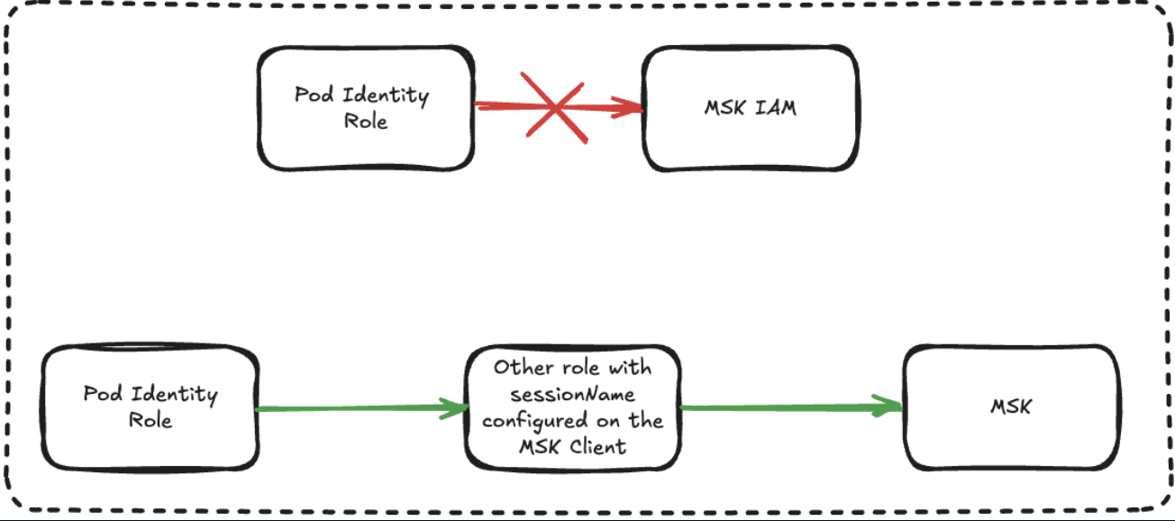 ์ด ๋ฌธ์ ๋ฅผ ํด๊ฒฐํ๋ ๊ฐ์ฅ ํจ๊ณผ์ ์ธ ๋ฐฉ๋ฒ์ MSK ์ ์ฉ IAM Role์ ์์ฑํ๊ณ , aws-msk-iam-auth ๋ผ์ด๋ธ๋ฌ๋ฆฌ์ awsRoleArn๊ณผ awsRoleSessionName ์ค์ ์ ํตํด Kafka ํด๋ผ์ด์ธํธ๊ฐ ํญ์ ๊ณ ์ ๋ ์ธ์ ์ด๋ฆ์ผ๋ก MSK์ ์ ๊ทผํ๋๋ก ๊ตฌ์ฑํ๋ ๊ฒ์ด๋ค. ์ด๋ฅผ ํตํด Pod Identity์ ์ฅ์ ์ ์ ์งํ๋ฉด์๋ MSK์์ ์์ ์ ์ธ ์ฐ๊ฒฐ์ ๋ณด์ฅํ ์ ์๋ค.