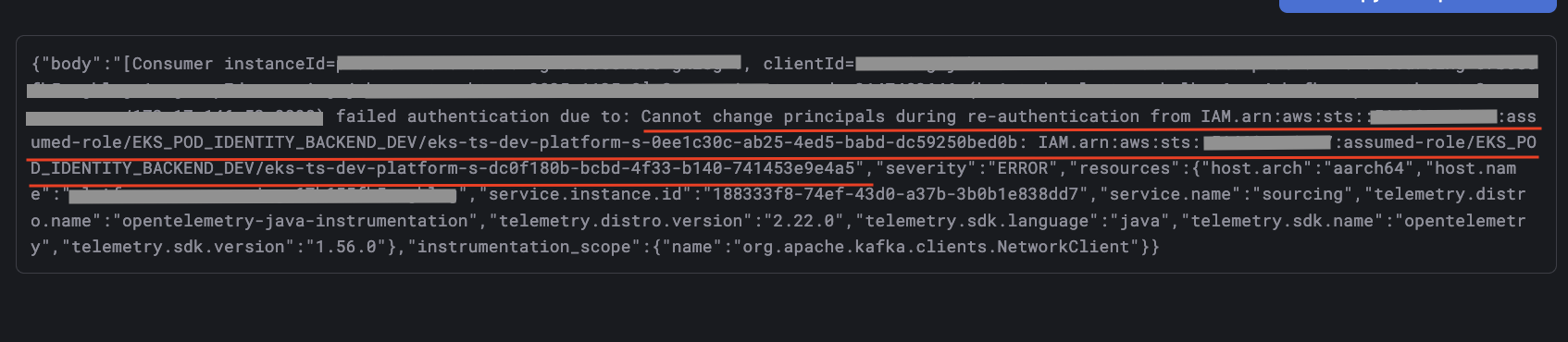 ๋ ์ธ์ ์ด๋ฆ์ UUID ๋ถ๋ถ์ด ๋ค๋ฅธ ๊ฒ์ ํ์ธํ ์ ์๋ค. MSK๋ ์ด๊ธฐ ์ธ์ฆ ์ ์ฌ์ฉ๋ principal๊ณผ ์ฌ์ธ์ฆ ์์ principal์ด ์ผ์นํด์ผ ํ๋๋ฐ, Pod Identity๊ฐ ์๊ฒฉ ์ฆ๋ช ์ ๊ฐฑ์ ํ๋ฉด์ ์ธ์ ์ด๋ฆ์ด ๋ณ๊ฒฝ๋์ด ์ธ์ฆ์ด ์คํจํ๊ฒ ๋๋ค.