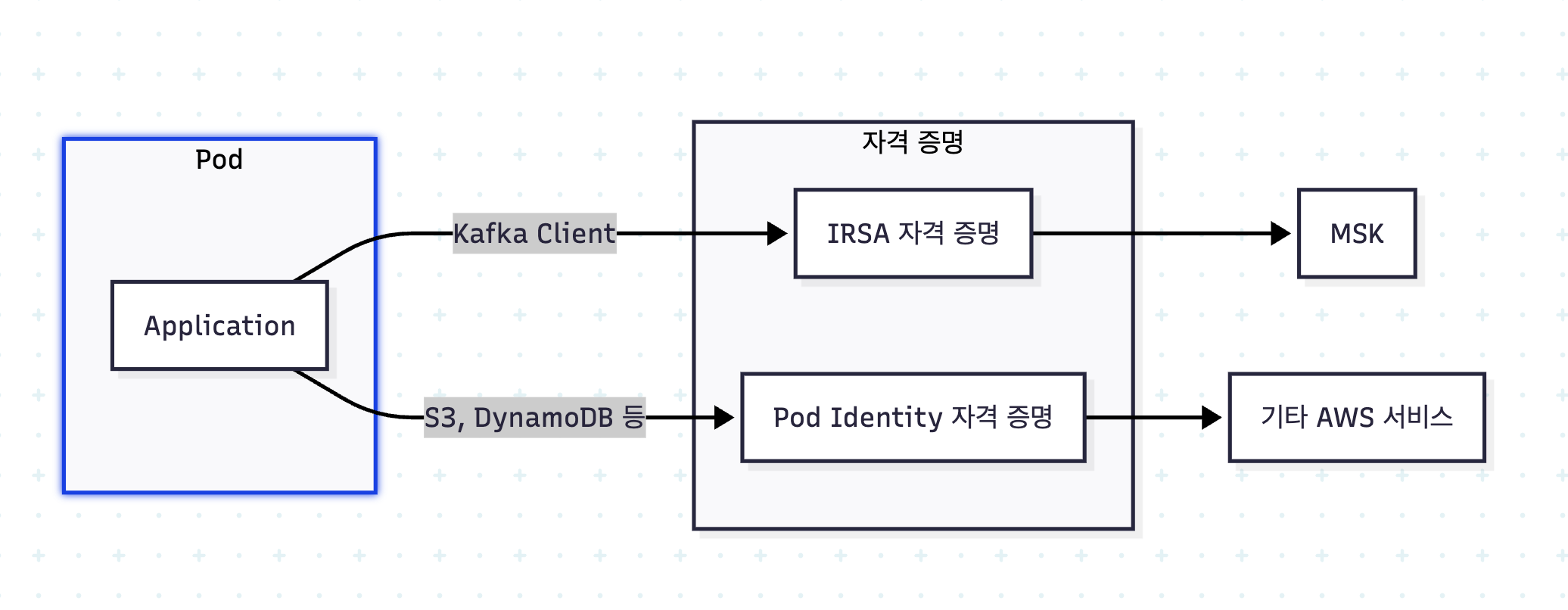 ๊ฐ์ฅ ๊ฐ๋จํ ์ ๊ทผ ๋ฐฉ์์ด๋ค. MSK์ ์ ๊ทผํ๋ ๋ถ๋ถ๋ง IRSA๋ฅผ ์ ์งํ๊ณ , ๋๋จธ์ง AWS ์๋น์ค์ ๋ํด์๋ Pod Identity๋ฅผ ์ฌ์ฉํ๋ค.
