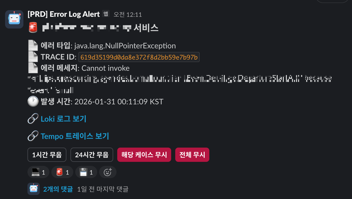 ํ์ฌ ์๋ฌ ๋ก๊ทธ๋ฅผ ๊ด๋ฆฌํ๋ ์ฃผ์ฒด๋ Loki์ด๋ค. ์ฐ๋ฆฌ๊ฐ ์ํ๋ "์ ๋ง ํ์ํ ์๋ฌ ์๋ฆผ"๋ง ๋ณด๋ด๋ ค๋ฉด, ๊ฒฐ๊ตญ Prometheus Alertmanager์์ ์ปค์คํ ํ๊ฒ ๊ตฌํํ Webhook ์๋ฒ๋ก ์๋ฆผ์ ์ ๋ฌํด์ผ ํ๋ค. ๊ทธ๋์ผ ์๋ฆผ์ ์ฐ๋ฆฌ ๋ง์๋๋ก ์ปจํธ๋กคํ ์ ์๋ค.