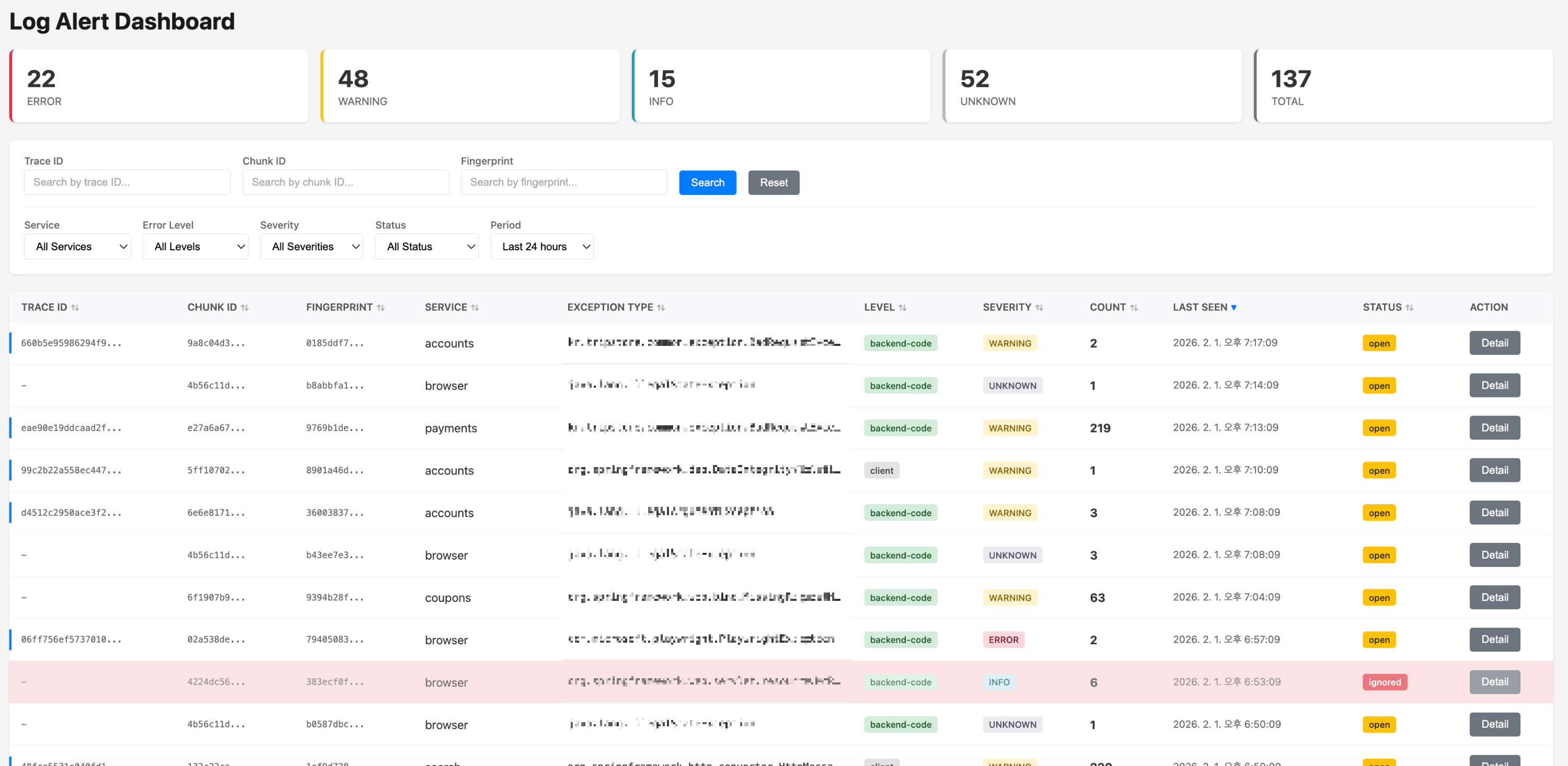 Chunk ID๋ ์ ์ฌ ์๋ฌ๋ฅผ ํ๋์ ๊ทธ๋ฃน์ผ๋ก ๋ฌถ๋๋ค. ๋ฉ์์ง์์ ID ๊ฐ(์ซ์, UUID, hex)์ ์ ๊ฑฐํ ์ ๊ทํ๋ ํด์๋ฅผ ์ฌ์ฉํ๋ค. g-z ๋ฌธ์๋ง ๋จ๊ธฐ๋ ์ ๊ทํ ์ ๋ต์ผ๋ก ๋ณ๋ ๊ฐ์ ํจ๊ณผ์ ์ผ๋ก ํํฐ๋งํ๋ค.