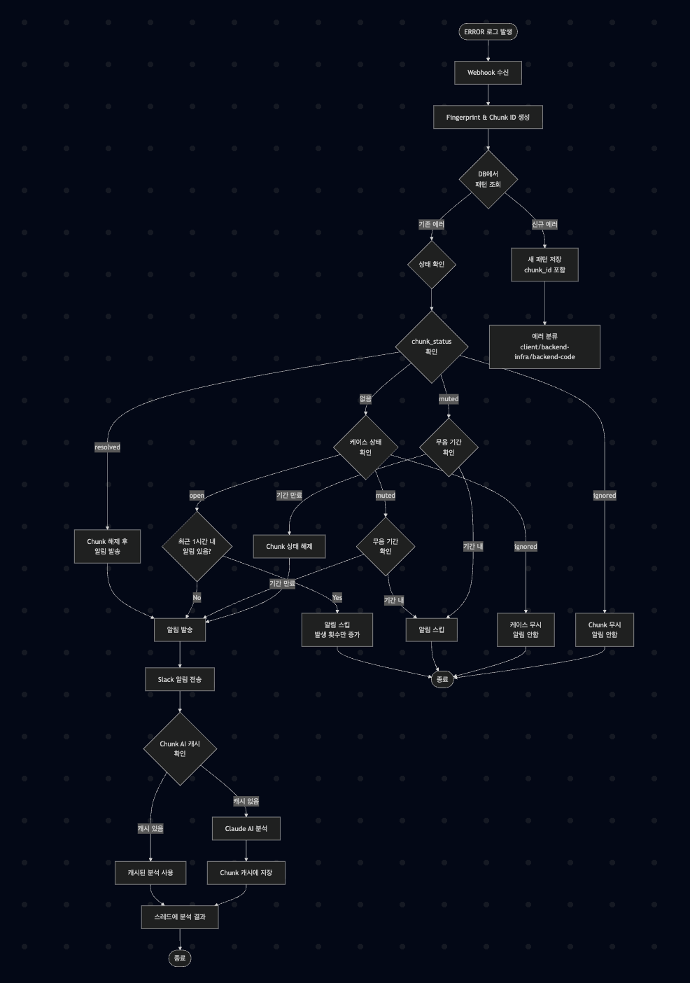 ์ด๋ ๊ฒ ํ๋ฉด userId=12345์ userId=67890 ์๋ฌ๊ฐ ๊ฐ์ Chunk๋ก ๋ฌถ์ธ๋ค. "๋ฌด์" ์ค์ ์ Chunk ๋จ์๋ก ์ ์ฉํ๋ฉด ํ ๋ฒ์ ์ก์ ์ผ๋ก ๋ชจ๋ ์ ์ฌ ์๋ฌ๋ฅผ ๋ฌด์ํ ์ ์๋ค. AI ๋ถ์ ๊ฒฐ๊ณผ๋ Chunk ๋จ์๋ก ์บ์ํ๋ฉด ํ ํฐ์ ์ ์ฝํ ์ ์๋ค.