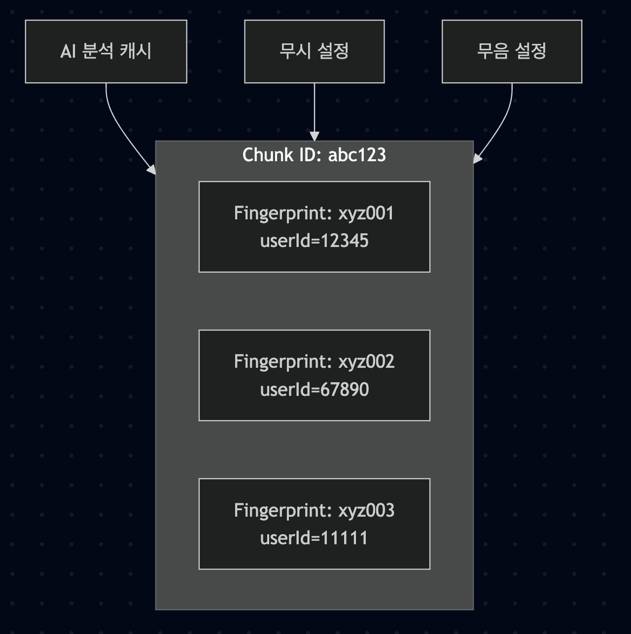 ํ๋์ Chunk ID ์๋์ ์ฌ๋ฌ Fingerprint๊ฐ ์ํ๋ค. AI ๋ถ์ ๊ฒฐ๊ณผ๋ Chunk ๋จ์๋ก ์บ์๋์ด ์ ์ฌ ์๋ฌ ๊ฐ์ ๊ณต์ ๋๋ค. ๋ฌด์/๋ฌด์ ์ค์ ๋ Chunk ๋จ์๋ก ์ ์ฉ๋์ด ํ ๋ฒ์ ์ก์ ์ผ๋ก ๋ชจ๋ ์ ์ฌ ์๋ฌ๋ฅผ ์ฒ๋ฆฌํ ์ ์๋ค.